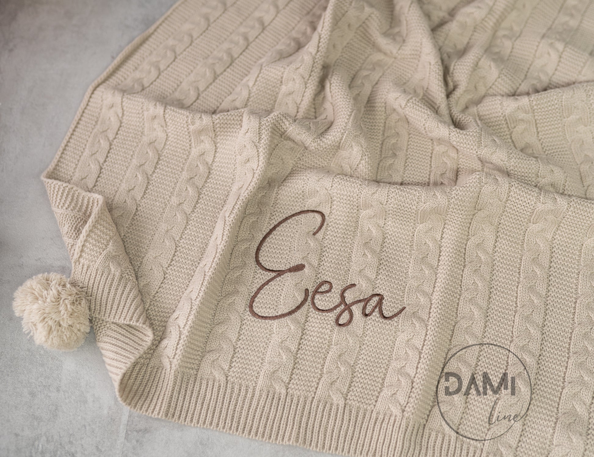 Personalised COFFEE knitted baby blanket with 2 Pom-poms
