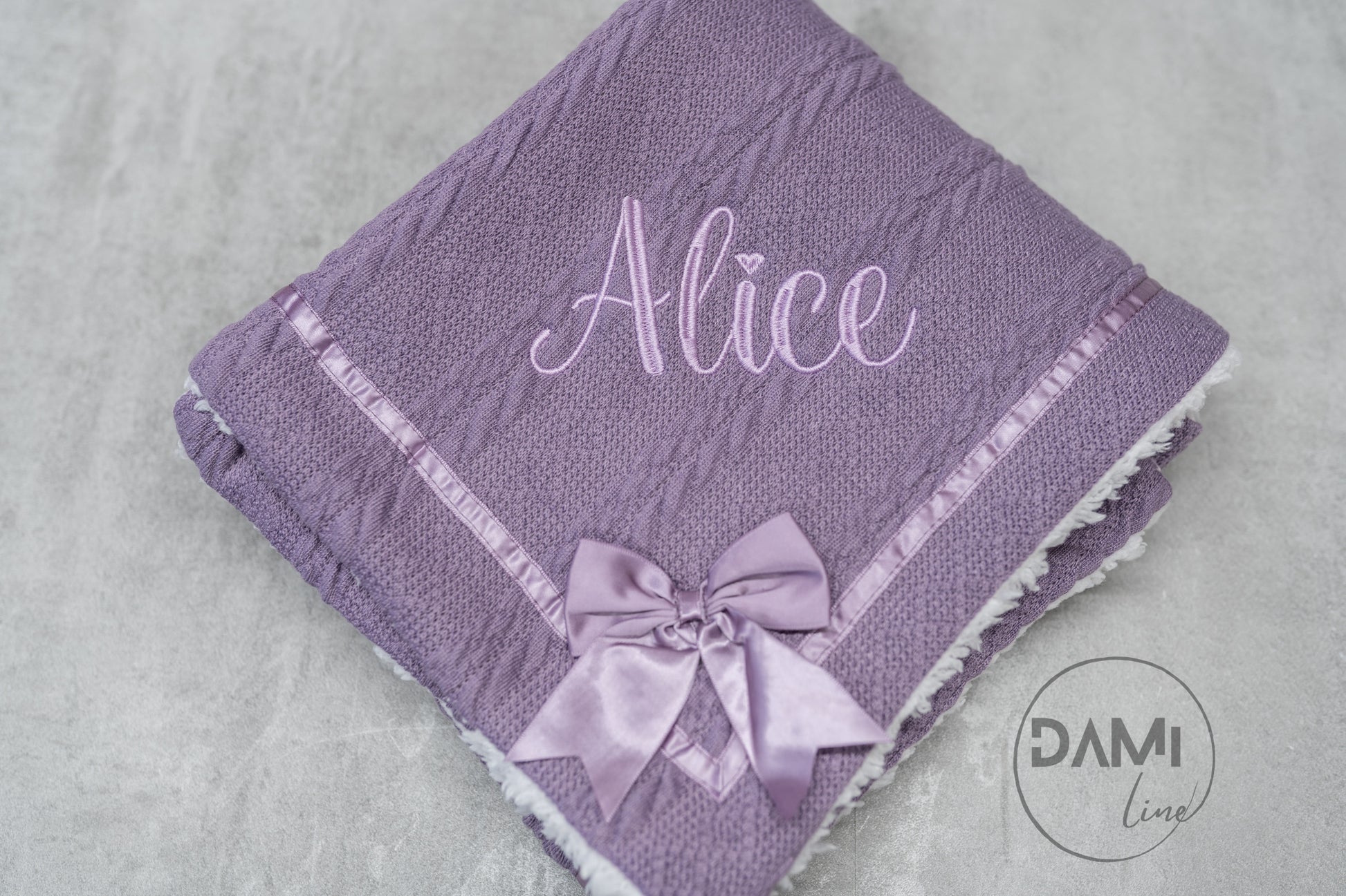 Personalised PURPLE baby knitted blanket with bow